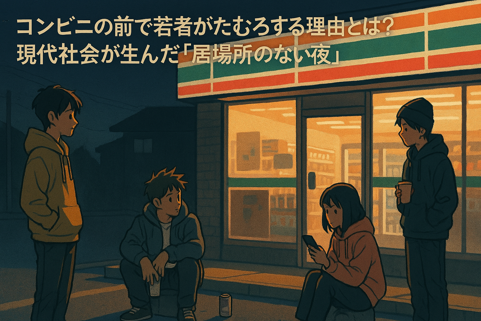 深夜のコンビニの前、缶コーヒーを片手にたむろする若者たち。