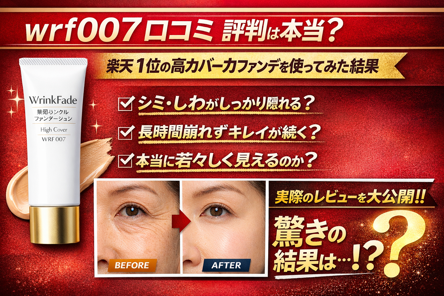 年齢を重ねるごとに気になるシミやしわ、そして毛穴の開き。そんな悩みを1本でカバーしてくれると話題なのが「WrinkFade 薬用 リンクル ファンデーション ハイカバー(型番:wrf007)」です。楽天で週間1位を獲得した実績もあり、実際に使った多くの人が高く評価しているファンデーション。美白としわ改善の有効成分「ナイアシンアミド」配合で、スキンケアしながらメイクができるのが大きな魅力です。